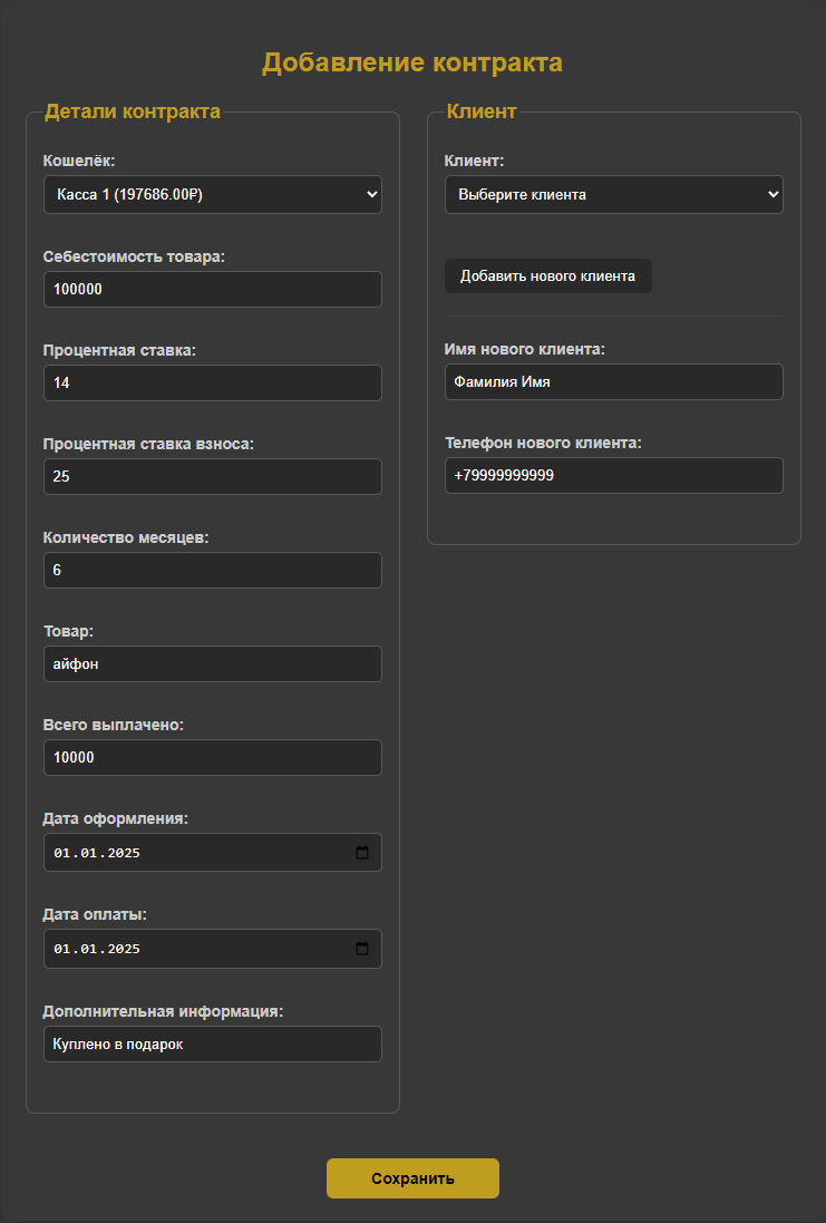 Пример формы создания контрактаЗаполните параметры договора и данные клиента.